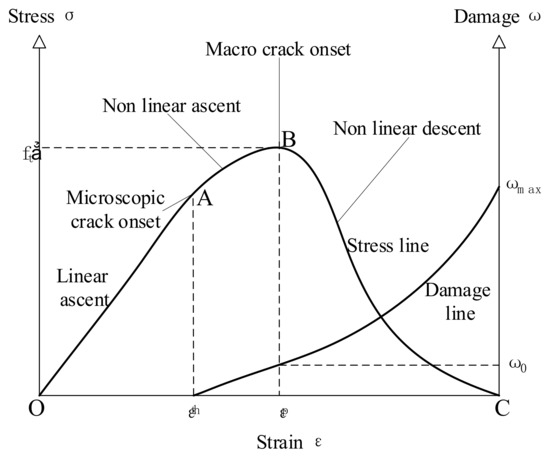 Material damage refers to the process of deterioration of the mechanical properties of the microstructure of the material under an external load or environmental action. It is also the process of the initiation, development, and polymerization of microdefects. The expansion and deformation of concrete materials increase with the stress caused by the crystallization pressure in their pores such that the density of cracks in them increases, and the damage continues to dynamically develop from their surface to inside them. The changes in damage to the concrete material with stress and strain are shown in Figure 14. Section OA represents the elastic stage of concrete, in which it contains pores and microcracks, but this does not affect its strength such that it sustains no damage. Section AB is the stage of a non-linear increase, in which new microcracks begin to form at point A, while the microcracks at point B gather to form macroscopic cracks that lead to the failure of concrete. Section BC represents the stage of a non-linear decline because the concrete has been damaged. Its stress decreases rapidly, the strain on it continues to increase, and the material enters the softening stage until the structure fails. Damage to concrete material reaches its maximum value at this time. In the relevant figure, ft’ is the peak tensile stress, εth is the threshold strain at which microcracks form, εp is the strain corresponding to the peak stress, ω0 is the damage corresponding to the peak stress, and ωmax is the maximum damage.