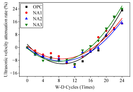 The velocity of ultrasonic waves through the concrete samples changed during their erosion by the sodium sulfate solution in the W–D cycles, as shown in Figure 9. The velocity of ultrasonic waves in all samples began to decrease during the 12 W–D cycle before, and then it increased slowly with the number of W–D cycles. The velocity of ultrasonic waves in specimen NA1 was the highest, while that in specimen OPC was the lowest. The velocity of ultrasonic waves in specimen NA2 was lower than that in NA3. After the 12th cycle, the velocity of ultrasonic waves of the specimens decreased rapidly with a growing number of W–D cycles. We can infer from the results that the structure of the concrete was intact and was not damaged by the sodium sulfate solution under fewer than 12 W–D cycles for two reasons. On the one hand, although concrete was eroded by the sodium sulfate solution after 28 days of aging, its physical properties became more robust over time as well, and the enhancement in its overall performance was greater than the effect of its erosion by sodium sulfate. On the other hand, the crystals generated in the sodium sulfate solution under short-term erosion filled the pores of the concrete to make its internal structure denser, and this led to a slight increase in the velocity of ultrasonic waves. After 12 W–D cycles, the physical properties of concrete did not further develop, and the erosive effect of sodium sulfate became more apparent. Pores and cracks began to appear in the internal structure of concrete, the aggregates and mortar were no longer tightly bonded to each other, and the shape of the structure loosened. The looseness of the concrete structure became increasingly evident with an increase in the number of W–D cycles, and because of this, the velocity of ultrasonic waves of the specimens decreased. As in the previous tests, specimen NA1 showed the highest resistance to erosion by the sodium sulfate solution.