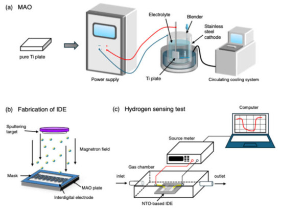 Schematic illustrations depicting (a) the MAO process, (b) magnetron sputtering for interdigital electrode (IDE) fabrication, and (c) the hydrogen sensing test.