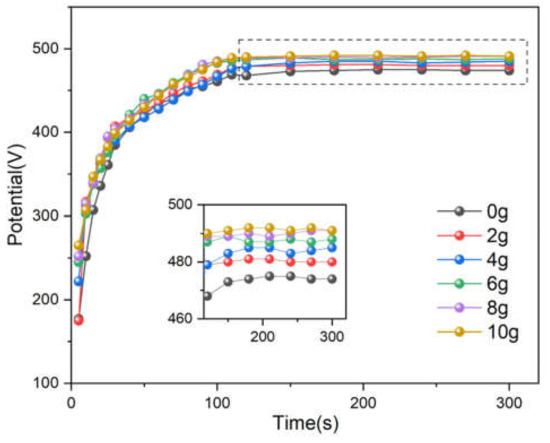 The voltage-time curves of MAO process in electrolytes containing varying concentrations (0–10 g/L) of Nb2O5 nanoparticles.