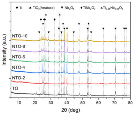 where K is the Scherrer constant (0.9), β is the FWHM of the diffraction peak, λ is the wavelength of Cu Kα X-ray (0.154 nm), and θ is the Bragg angle, which is half of the diffraction angle. The average crystalline size of Nb2O5 calculated from the Nb2O5 (130) plane is 24.5 nm, indicating that most of the incorporated Nb2O5 particles remain in the nanocrystalline structure. In addition to Nb2O5, two new Nb-doped TiO2 phases were observed in the Nb2O5-doped MAO samples, suggesting that the Nb2O5 doping process during MAO entails not only the incorporation and sintering of Nb2O5 nanoparticles, but also chemical reactions and the formation of new compounds under the influence of micro-arc discharge. The formation of TiNb2O7 and Ti0.95Nb0.95O4 phases during the MAO process is driven by high-temperature plasma micro-discharges and a strong electric field. During the plasma discharge and reaction, Nb2O5 nanoparticles are ionized in the electrolyte, releasing Nb5+; ions, which integrate into the TiO2 matrix through substitution and diffusion, ultimately leading to the nucleation of these mixed-metal oxides. The TiNb2O7 and Ti0.95Nb0.95O4 phases exhibit nanocrystalline structures with mixed-metal oxide characteristics, offering enhanced lattice distortions and improved functional properties, such as conductivity and catalytic activity [29,30].