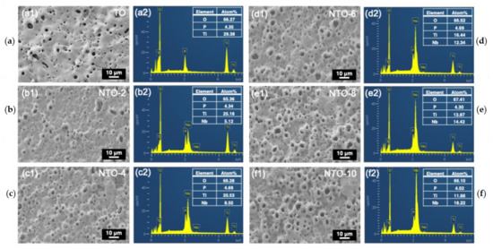 SEM images (a1,b1,c1,d1,e1,f1) and related EDS spectra (a2,b2,c2,d2,e2,f2) showing the surface morphology and elemental composition of different samples: (a) TO, (b) NTO-2, (c) NTO-4, (d) NTO-6, (e) NTO-8, and (f) NTO-10.