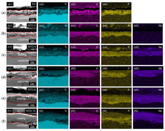 Cross-sectional SEM images (a1,b1,c1,d1,e1,f1) and related EDS mapping results (a2–a4,b2–b5,c2–c5,d2–d5,e2–e5,f2–f5) of different samples: (a) TO, (b) NTO-2, (c) NTO-4, (d) NTO-6, (e) NTO-8, and (f) NTO-10.