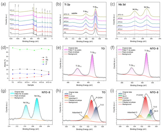 (a) XPS survey and high-resolution XPS spectra of Ti 2p (b) and Nb 3d (c) for different samples. (d) Atomic percentage of Ti, Nb, O, and P calculated from XPS spectra of different samples. Peaks deconvolution results of (e) Ti 2p for TO, (f) Ti 2p for NTO-8, (g) Nd 3d for NTO-8, (h) O 1s for TO, and (i) O 1s for NTO-8.