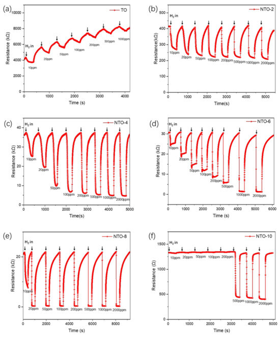 Dynamic response of the sensors based on (a) TO, (b) NTO-2, (c) NTO-4, (d) NTO-6, (e) NTO-8, and (f) NTO-10 toward 10, 20, 50, 100, 200, 500, 1000, and 2000 ppm hydrogen.