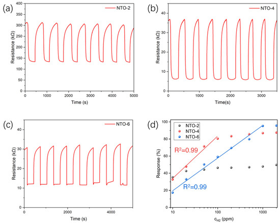 The hydrogen sensing behaviors of different samples are illustrated in Figure 7. During the hydrogen sensing tests, the TO sample exhibited significant baseline drift, making it difficult to calculate the response (S) despite resistance fluctuations upon exposure to H2; concentrations ranging from 10 ppm to 1000 ppm. In contrast, the NTO-2, NTO-4, NTO-6, and NTO-8 samples demonstrated a consistent and systematic increase in resistance when exposed to H2 concentrations of 10 ppm to 2000 ppm, indicating superior hydrogen sensitivity. The calculated S was used to evaluate hydrogen sensor performance. Among these samples, NTO-2 showed response values ranging from 35.3% to 49.7% across the tested concentration range. However, beyond 100 ppm (S = 46.3%), the increase in S became very slow, limiting its ability to accurately measure higher hydrogen concentrations. NTO-4 displayed a broader response range, with S increasing significantly from 32.7% to 80.4% at concentrations between 10 ppm and 100 ppm, though the increase diminished at higher concentrations. In comparison, NTO-6 exhibited a steady and continuous increase in resistance across the entire range, with response values ranging from 17.4% to 95.7%, demonstrating a wider detection range and higher stability. NTO-8 achieved exceptional sensitivity, with a response of 65.1% at 10 ppm, but increased to 98.4% at 20 ppm. Its response increase was minimal at higher concentrations, reaching 97.5% at 2000 ppm. Similarly, NTO-10 maintained a high response value of over 95% throughout the range of 10 ppm to 2000 ppm, but its sensitivity to changes in concentration was limited. Based on these findings, further analysis and discussion focused on the sensing properties of the NTO-2, NTO-4, and NTO-6 samples to evaluate their performance and applicability in hydrogen sensing.