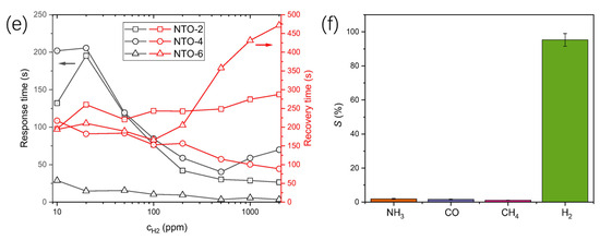 Figure 8a–c show the resistance responses of the NTO-2, NTO-4, and NTO-6 samples under repeated cycles of exposure to 100 ppm H2 and air. It can be observed that all three sensors exhibit excellent responses of repeatability and reversibility. The responses of the NTO-2, NTO-4, and NTO-6 samples as a function of hydrogen concentration are shown in Figure 8d. It can be observed that the NTO-4 and NTO-6 samples exhibit a linear relationship with the logarithmic value of hydrogen concentration (lgCH2) within certain ranges, specifically 10–100 ppm for NTO-4 and 10–1000 ppm for NTO-6. Notably, the NTO-6 sample shows a significant increase in S within its linear range, which is critical for accurately detecting hydrogen concentrations. Figure 8e presents the response time (tres) and recovery time (trec) of different sensors as a function of hydrogen concentration. As the hydrogen concentration increases, the response time of the sensors generally decreases, owing to the faster reaction rate at higher H2 concentrations. Among the samples, NTO-6 exhibits the shortest response time overall, with a response time of just 28.7 s at 10 ppm and approximately 3.5 s at 2000 ppm. Regarding recovery time, NTO-4 performs better overall, displaying shorter recovery times compared to NTO-2 and NTO-6, with recovery time decreasing further as the hydrogen concentration increases. As seen in Figure 8f, the selectivity of the sensors was assessed by testing the NTO-6 sample with H2 and interference gasses such as NH3, CH4, and CO. The results show that NTO-6 exhibits superior resistance to interference from these gasses, highlighting its strong selectivity for hydrogen detection.