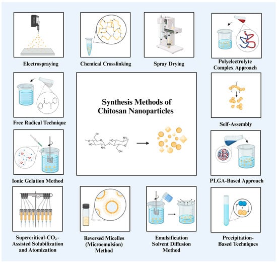 The biological technique utilizing microorganisms proved superior to the chemical method, as it maintained the structural integrity of chitin. Spray drying is one of these approaches; chitosan is mostly dissolved in aqueous acetic acid, and NPs are produced by passing this solution through a nozzle at temperatures ranging from 120 to 150 °C. This technique is used rather frequently in the manufacture of chitosan microparticles as well as in the separation of NPs that have been acquired via the use of other techniques [50]. The supercritical-CO2-assisted solubilization and atomization (SCASA) technique is an environmentally friendly technology that eliminates the need for toxic solvents by being prepared simply using water and carbon dioxide. Chitosan is dissolved in water by means of compressed carbon dioxide under high pressure, which is a pioneering environmentally friendly technology. The chitosan solution is delivered to a fluidized bed by a spraying nozzle, which ultimately results in atomization after a dissolving stage that takes a considerable amount of time (48 h). In the course of the drying process, NPs are produced, and they are collected by a filter that is situated on top of the fluidized bed [61].