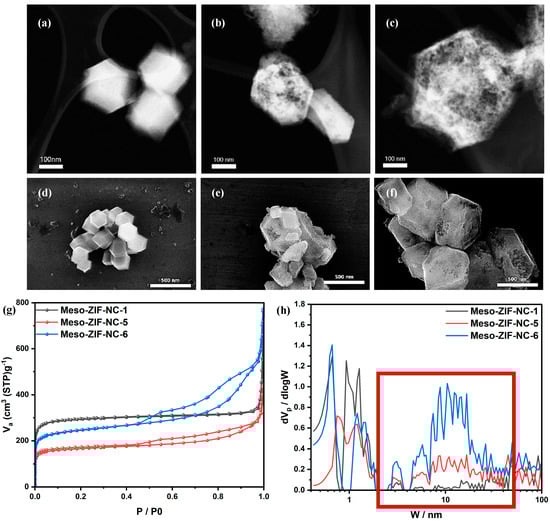 STEM, SEM images of (a,d) Meso-ZIF-NC-1, (b,e) Meso-ZIF-NC-5, (c,f) Meso-ZIF-NC-6, (g) N2 adsorption/desorption isotherms of Meso-ZIF-NC, and (h) pore size distribution curves of Meso-ZIF-NC analyzed by NLDFT method.