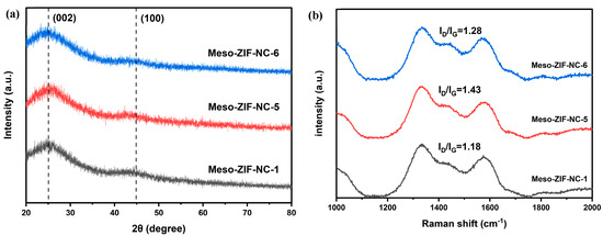 (a) XRD patterns and (b) Raman spectra of Meso–ZIF–NC-1, Meso-ZIF-NC-5 and Meso-ZIF-NC-6.