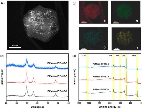 (a) STEM image and (b) Elemental mapping images of Pt/Meso-ZIF-NC-5. (c) XRD patterns and (d) XPS full spectrum of Pt/Meso-ZIF-NC-1, Pt/Meso-ZIF-NC-5, and Pt/Meso-ZIF-NC-6.