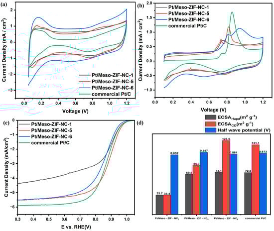 In the CV analysis (Figure 5a), Pt/Meso-ZIF-NC-6 exhibited the highest capacitance among all the samples. This result can be attributed primarily to the large mesopore volume of Pt/Meso-ZIF-NC6, which enhances the accessibility of the electrolyte to the electrode surface. The highly developed mesoporous structure increases the effective surface area, allowing for greater charge storage capacity. This combination of structural and compositional features explains the superior capacitive behavior of Pt/Meso-ZIF-NC-6. The CO-stripping results (Figure 5b) reveal trends similar to those observed in the CV measurements. Pt/Meso-ZIF-NC-6 demonstrated a pronounced CO desorption peak, followed by a capacitive response that is significantly higher than those of the other samples. The higher capacitive behavior is consistent with the large mesopore volume and well-dispersed Pt nanoparticles of Pt/Meso-ZIF-NC-6. These structural characteristics allow for a more uniform CO adsorption and desorption process, maximizing the electrochemical activity. Additionally, a notable feature of the CO-stripping results for Meso-ZIF-NC-based catalysts is the splitting of the CO oxidation peak. This splitting may be attributed to the residual Zn present in the carbon matrix. Zn, introduced during the synthesis of Meso-ZIF-NC, can alter the local electronic environment and interaction between CO and Pt nanoparticles, leading to the observed peak splitting. This phenomenon highlights the influence of Zn on the electrochemical behavior of the catalysts and suggests that its presence could modulate the CO adsorption and desorption characteristics. In the LSV analysis for the ORR (Figure 5c), Pt/Meso-ZIF-NC-5 demonstrated the highest half-wave potential, indicating the best catalytic performance among the samples. In contrast, Pt/Meso-ZIF-NC-1 exhibited the lowest ORR activity. This can be attributed to the distribution of Pt nanoparticles on the surface due to insufficient mesopores or structural constraints, which leads to a reduced electrochemical surface area and poor catalytic performance. On the other hand, while Pt/Meso-ZIF-NC-6 has the most well-developed mesoporous structure, the Pt nanoparticles are more likely to be embedded deep within the pores. This reduces their accessibility for oxygen reduction, slightly limiting the ORR activity compared to Pt/Meso-ZIF-NC-5. The electrochemical analysis highlights the significant role of mesopore volume, Pt dispersion, and carbon support properties in determining the performance of Pt/Meso-ZIF-NC catalysts. While Pt/Meso-ZIF-NC-6 benefits from its large mesopore volume and enhanced capacitance, Pt/Meso-ZIF-NC-5 achieves the best catalytic performance due to its optimal structural and compositional characteristics. These findings underline the importance of fine-tuning the synthesis conditions to balance mesopore accessibility and Pt nanoparticle dispersion.
