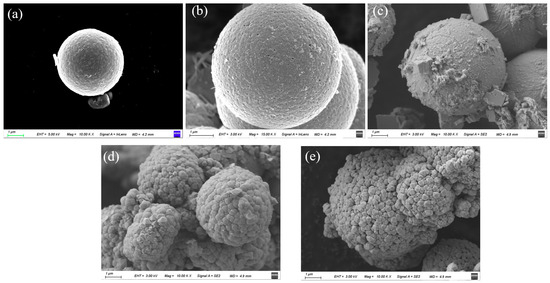 The morphology and microstructure of the SnO2@Bi2O3 composite materials were further investigated using SEM. As shown in Figure 2a, pure SnO2 exhibits a typical spherical structure with a rough surface and an average diameter of approximately 4 µm. Figure 2b shows the SnO2@Bi2O3 composite synthesized at 100 °C, where a small amount of Bi2O3 is sparsely distributed on the SnO2 surface. This could be attributed to the fact that at low temperatures, the Bi2O3 grains are relatively small and not fully crystallized, existing predominantly in an amorphous or poorly crystallized state. As the temperature increased to 120 °C, Bi2O3 gradually formed sheet-like and flocculent structures, partially covering the SnO2 surface (Figure 2c). The increase in temperature promotes further crystallization of Bi2O3 and may lead to the formation of two-dimensional structures, such as sheet-like shapes, through self-assembly. The formation of these sheet-like structures can be attributed to the differences in crystal surface energy and growth rates, causing Bi2O3 to preferentially grow along specific crystal planes, resulting in sheet-like or flocculent morphologies. When the temperature was further elevated to 140 °C (Figure 2d), the morphology of Bi2O3 underwent a significant change, with the sheet-like and flocculent structures disappearing and being replaced by well-defined polyhedral structures. The SnO2surface was almost completely covered by Bi2O3, with the coverage becoming more uniform, though some residual sheet-like structures remained. At 160 °C (Figure 2e), the sheet-like Bi2O3 structures completely disappeared, and the surface morphology transformed into uniform polyhedron, resulting in a fully encapsulated structure, consistent with the XRD results. This transformation may be related to the rearrangement of crystals, crystal plane growth, and self-assembly mechanisms at high temperatures. At elevated temperatures, the solubility and diffusion rate of Bi2O3 increase, facilitating the crystal growth and optimized arrangement of Bi2O3 grains, driving the transition from sheet-like structures to polyhedral morphologies. The interfacial interaction between the SnO2 surface and Bi2O3 also promotes the uniform coating of Bi2O3, thereby forming stable polyhedral nanoparticles.