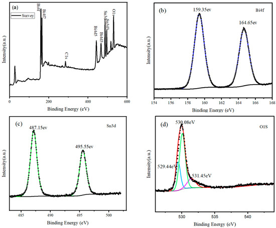 The chemical states and surface composition of the SnO2@Bi2O3 composite prepared at 160 °C were analyzed using XPS, as shown in Figure 5. The survey spectrum (Figure 5a) reveals distinct peaks corresponding to Sn, O, and Bi elements, confirming their presence in the sample. The signal from C is attributed to calibration, with the C 1s peak at 284.8 eV used as the reference for calibration. Figure 5b shows the high-resolution Bi 4f spectrum, with peaks at binding energies of 159.35 eV and 164.65 eV, corresponding to Bi 4f7/2 and Bi 4f5/2, respectively, which are characteristic peaks of Bi3+ [25,26]. The high-resolution Sn 3d spectrum (Figure 5c) exhibits peaks at 487.15 eV and 495.55 eV, corresponding to Sn 3d5/2 and Sn 3d3/2, indicating that Sn exists in the form of Sn4+ in the composite [27,28]. Figure 5d presents the high-resolution O 1s spectrum, which can be divided into three sub-peaks with binding energies at 529.44 eV, 530.08 eV, and 531.45 eV, corresponding to oxygen in Bi2O3 (blue), oxygen in SnO2 (green), and adsorbed oxygen (purple), respectively [29,30]. The XPS results further confirm that the SnO2@Bi2O3 composite consists of SnO2 and Bi2O3.