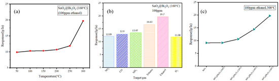 (a) Response of SnO2@Bi2O3 (160 °C) to 100 ppm ethanol at different operating temperatures; (b) Selectivity of SnO2@Bi2O3 (160 °C) at 300 °C for various gasses; (c) Response of SnO2, SnO2@Bi2O3 (100 °C), SnO2@Bi2O3 (120 °C), SnO2@Bi2O3 (140 °C), and SnO2@Bi2O3 (160 °C) to 100 ppm ethanol at 300 °C.
