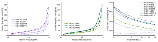 Surface area and Barrett–Joyner–Halenda (BJH) desorption pore volume and pore diameter of MGA-10/20/x series and MSA-10/20/x series.