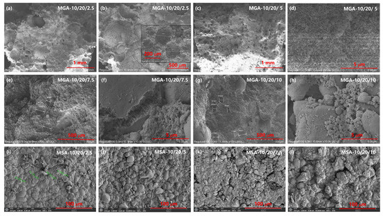 After complete curing and hardening, the hierarchical porous structure is well preserved, with a mesopore size ranging from 3 to 8 nm, as indicated in the BET pore volume data, and a micropore size in the range of 1–10 μm can be concluded from the SEM images, as well as the micro-CT analyses. Figure 3 displays the scanning electronic microscopy images (SEM) of the foamy aerogel coatings based on the different foaming agents, GA and SA, respectively. Considerable changes can be observed on the basis of the variation in the foaming agent concentrations. From the images shown in Figure 3i–l, it can be observed that the segment surfaces of the aerogel composites with SA as the foaming agent are bumpy and condensed, with no obvious foamy structure observed in various MSA composites. Moreover, the size of the bumpy texture shows a decreasing trend as more aerogel particles are incorporated into the composites. Figure 3a–h show the section surfaces of the foamy aerogel coatings with an increasing amount of GA as the foaming agent. Compared to SA, GA has a stronger ability to hold water and to generate a microscale foamy structure, as well as preserve the nano-scale pore structure in the SiO2 aerogel; thus, the GA-based foamy coatings have an obviously hierarchical foamy structure from the SEM images of the section surfaces. As the filling amount of aerogel particles increases, the foamed pore diameter of the foamy coatings gradually decreases, and the wall thickness between pores gradually increases. From the broken gap in the resin-warped aerogel (Figure 3f), which is the main component of the walls between the pore structure, the internal structure of the aerogel particles is well preserved and relatively complete. It can be observed that not too many of the nanopores in the aerogels were filled with resin, which proves the feasibility of the protective effect of the foamed resin–aerogel composite thermal insulation coating on the overall pore structure of the aerogel.