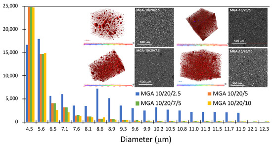 The pore size distribution analysis reveals that the majority of the pore volume is concentrated in the range of 4.5–5.6 μm, with variations in the pore count and size distribution observed across different samples. Specifically, the MGA-10/20/2.5 sample exhibits the highest pore volume within this range, while an increasing ratio (e.g., MGA-10/20/7.5 and MGA-10/20/10) leads to a reduction in the pore volume and a more uniform distribution. This trend suggests that modification of the synthesis conditions influences the material’s porosity, resulting in finer and more compact structures. Corresponding microstructural images further confirm this observation, showing larger, well-defined pores in lower-ratio samples and a denser pore network in higher-ratio samples. Such a hierarchical pore structure, combining micro- and mesopores, likely enhances the material’s functional properties, such as its thermal insulation or specific surface area, making it suitable for advanced applications.