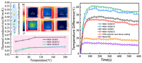 These results are consistent with the previous characterization of the microstructure. Since MGA 10/20/10 shows the most uniform pore size distribution, the aerogel-stabilized hierarchical porous structure contributes to the overall reduction in thermal conductivity. The thermal conductivities of MGA 10/20/7.5 and MGA 10/20/10 are similar when the testing temperature exceeds 80 °C, which is due to the limitations of the pore size and the resin component in the composite. When the temperature is low, the thermal conductivity of the aerogel composite is primarily influenced by the insulating behavior of the porous phase. However, at moderate and high temperatures, the resin outweighs the insulating properties of the pores and leads to a greater thermal conductivity at a higher temperature.