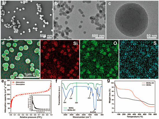 Figure 1a displays the SEM image of the synthesized MONs-SHs in an ethanol–water system. As observed, the nanoparticles exhibit the features of spherical morphology, homogeneous particle size, and good monodispersity. The diameter of the nanoparticles was estimated to be about 182 nm (Figure S2). Figure 1b,c presents the TEM images of MONs-SHs, which clearly reflect the pore structure of the particles. In addition, when BTEE is not added, the white colloidal solution could not be obtained, as shown in Figure S3. From the elemental mapping of the MONs-SH sample in Figure 1d, it can be seen that the chemical composition of MONs-SHs consists of Si, O, and S elements, which are evenly distributed in nanoparticles. In addition, based on the EDS spectra, the weight content of Si, O, and S elements is 54.8 wt%, 33.4 wt%, and 11.7 wt%, respectively, without considering C and H elements, suggesting that Si and O are the main elements (Figure S4). The N2 adsorption–desorption isotherms of MONs-SHs suggest the characteristics of the type II curve based on the classification of physisorption isotherms by the International Union of Pure and Applied Chemistry, and adsorption behavior occurs under high relative pressures P/P0 of about 0.9, revealing the micro-mesoporous features of the sample [23], as shown in Figure 1e. The BET surface area of the sample was 729.15 m2 g−1, and the total pore volume was 0.45 cm3 g−1. Remarkable micropores and mesopores could be observed in the pore-size distribution curves of MONs-SHs, where micropores occupy a major portion. However, the average pore size was calculated to be about 2.71 nm; hence, the MONs-SH samples prepared in an ethanol–water system were identified as mesoporous materials. FT-IR was employed for the characterization to explore whether -SH is successfully modified in the nanoparticles, as depicted in Figure 1f. The broad absorption peak at 3440 cm−1 is attributed to the stretching vibration peak of -OH. The Si-O-Si vibration stretching peak is found at 1000–1100 cm−1, and the band located at 910 cm−1 belongs to the Si-OH [24,25]. The characteristic absorption peaks of -CH vibration in the organosilicon skeleton are observed in the range of 2900–2980 cm−1 and 1410–1420 cm−1 [26]. The characteristic absorption peak of MONs-SH at 2580 cm−1 is attributed to the -SH stretching vibration, which is not observed in MONs [25]. In addition, the TG analysis results reveal the weight loss of the materials at 30–150 °C, which is attributed to the desorption of physiosorbed water molecules. The obvious weight loss starts at 250 °C, which is ascribed to the decomposition of the MPTMS groups and bridged organic groups. It is worth noting that the weight loss of MONs-SHs at 200–450 °C is significantly higher than that of MONs (Figure 1g). This is mainly attributed to the decomposition of sulfhydryl groups [27,28]. Furthermore, the carbon and sulfur analysis displayed that the S element amount is 10.9 wt% (Table S1). In summary, the successful modification of sulfhydryl groups on mesoporous organosilica nanoparticles could be confirmed.