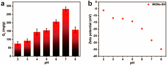 (a) Effect of pH value on the adsorption performance of Pb2+ on MONs-SHs. Reaction condition: Pb2+ solution concentration 0.02 mol L−1, adsorbent weight 10 mg, reaction time 60 min, solution volume 10 mL, (b) Zeta potential of MONs-SHs under different pH values.