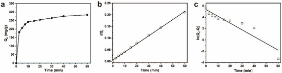 The influence of reaction time on the adsorption amount and adsorption kinetic process of Pb2+ ions on MONs-SHs is further explored in the experiments, and the results are presented in Figure 3. The adsorption capacity of Pb2+ ions on MONs-SHs exhibits a rapidly increasing trend within the initial 10 min. Then, the adsorption capacity tends to slow down gradually, and basically reaches equilibrium at about 30 min. Two different kinetic models, the pseudo-first-order (Equation (1)) and pseudo-second-order response models (Equation (2)), are chosen for fitting the data to study the adsorption kinetic process in depth, and the calculated results and parameters are shown in Table 1. Compared with the R2 value (0.871) calculated from the primary reaction model, the adsorption kinetics of Pb2+ on MONs-SHs is more in line with the secondary reaction model with the R2 value of 0.998. In addition, the calculated adsorption amount Qe (285.71 mg g−1) is close to the experimental results (283.86 mg g−1), further proving that the adsorption of Pb2+ on MONs-SHs is a chemisorption process [36].