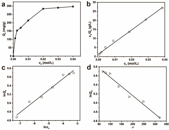 The adsorption capacity and models of the MONs-SHs towards various concentrations of Pb2+ ions are presented in Figure 5. As shown in Figure 5a, the MONs-SHs exhibit a low adsorption capacity at low Pb2+ ions concentrations, and the adsorption capacity increases with the increase of Pb2+ concentration. When the Pb2+ concentration in the solution is 0.04 mol L−1, the adsorption amount reaches the maximum value of 297.12 mg g−1. To further elaborate the adsorption mechanism of Pb2+ ions on MONs-SHs, Langmuir (Equation (6)) and Freundlich (Equation (7)) isotherm models are chosen for the calculations, respectively [32,39].