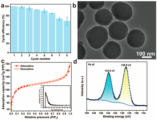 (a) Adsorption/desorption experiments to demonstrate the reusability of MONs-SHs for Pb2+ ions, (b) TEM image, (c) N2 adsorption isotherm and pore-size distribution curves, and (d) XPS spectra of Pb 4f peaks for the MONs-SHs used.