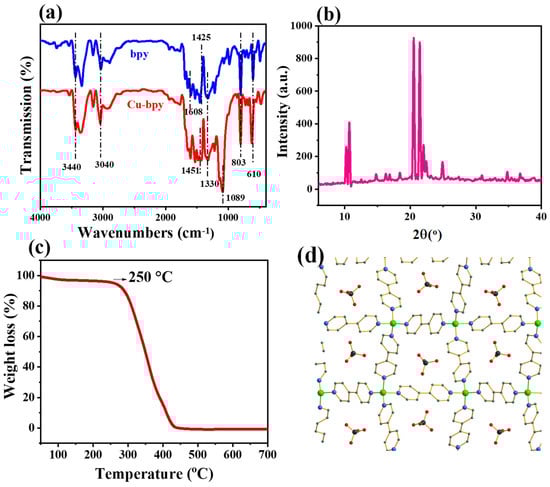 (a) Fourier transform infrared spectroscopy (FT-IR) spectra, (b) X-ray diffractograms, (c) TG curve of Cu-bpy, and (d) crystal structure diagram of Cu-bpy.