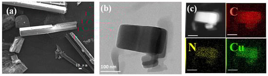 The morphology of Cu-bpy was investigated via scanning using an electron microscope (SEM) and a high-resolution transmission electron microscope (HR-TEM). The SEM images obtained show that Cu-bpy forms micrometer-sized rod-like crystals with widths ranging from 100 to 500 nm. The HR-TEM images (Figure 2b) showed that the grinded Cu-bpy took the form of a rectangular structure with a range of 100 to 200 nm after ultrasonication. EDX mapping (Figure 2c) showed that the elements C, N, and Cu were uniformly distributed in Cu-bpy.
