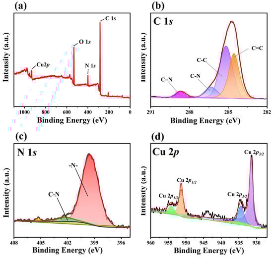 XPS spectra of Cu-bpy: (a) full spectrum, high-resolution XPS spectra of (b) C 1s, (c) N 1s, and (d) Cu 2p.