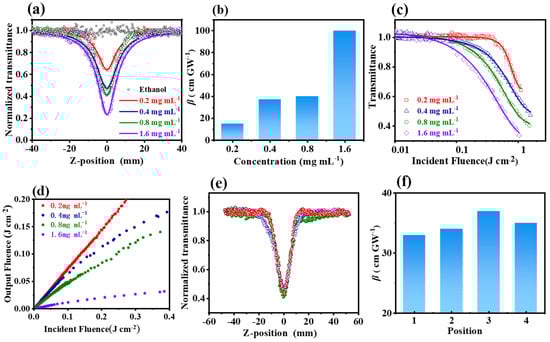 Nonlinear optical tests of Cu-bpy, Z-scan curve: (a) at different Cu-bpy concentrations with laser energy of 25 μJ; (b) variation of β values obtained by fitting Z-scan curves as a function of Cu-bpy concentration; (c,d) OL property of Cu-bpy with different concentrations; (e) Z-scan curves of Cu-bpy solution tested at random location of Cu-bpy solution (0.4 mg mL−1, 20 μJ); and (f) β values obtained from Z-scan curves of (e).
