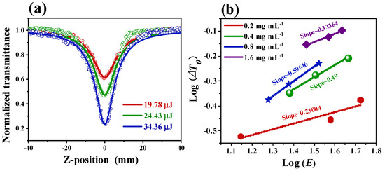 where C is the molar concentration of Cu-bpy and NA is Avogadro’s number. The calculated σg is 2.01 × 10−15 cm2. σex is larger than σg, indicating that the main NLO procedure for Cu-bpy is RSA. Cu-bpy suspensions with concentrations of 0.2 mg mL−1, 0.4 mg mL−1, 0.8 mg mL−1, and 1.6 mg mL−1 were performed for OA Z-scan experiments with different pulse laser energy values, respectively (Figure 6a and Figure S4). The normalized transmittance curved with increases in laser energy. This is because more Cu-bpy MOFs were involved in the NLO response as the laser intensity increased []. The same tendency was found in other concentrations. The relationship between the changes of normalized transmittance (ΔT0) and the laser pulse energy (E) was plotted (Figure 6b). A good linear relationship can be observed for ΔT0 and E in the log-log scale. The linear fit of the ΔT0~E plot shows a slope of 0.2~0.5 for Cu-bpy with a concentration range of 0.2 mg mL−1 to 1.6 mg mL−1. The effective number of photons absorbed will be n + 1 [,], therefore the RSA behavior of Cu-bpy is probably one-photon absorption (1PA).