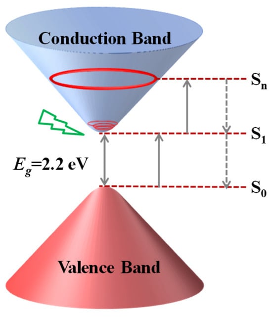 To demonstrate the principle of the RSA and OL properties of Cu-bpy, the schematic energy band diagram for Cu-bpy is shown in Figure 8. The photon energy of the excited laser at 532 nm was calculated to be 2.33 eV, which is larger than the calculated energy gap (Eg) of Cu-bpy (~2.28 eV); therefore, the absorption process was considered to be 1PA, which corresponds to the results derived from the slopes of ΔT0 and E in the log-log scale (Figure 6). When excited by the nanosecond laser at 532 nm, the ground state electrons of the Cu-bpy valence band (S0) absorbed one photon and jumped to the conduction band (S1) through an inter-band transition, resulting in the excited electron. The excited electron can then either return to the ground state (S0), or further in-band transition to Sn by absorbing another photon, resulting in 1PA induced excited state absorption (ESA). Due to the short decay time between Sn and S0 (picoseconds), the ESA on the nanosecond time scale does not deplete electrons at the S1 level [], so more absorption can take place at the excited state, resulting in the RSA behavior of Cu-bpy.