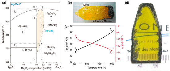 (a) Pseudo-binary phase diagram of the Ag2S–Ga2S3 system. Reproduced with permission [15]. Copyright 2007, Elsevier B.V. (b) Photograph of a AgGaS2 single crystal grown along the [001] direction with full size of 40 mm × 90 mm. (c) Temperature-dependent thermal expansion coefficients of a AgGaS2 crystal in the direction of the a and c axes, respectively. Reproduced with permission [18]. Copyright 2020, American Chemical Society. (d) Photograph of a AgGaS2 crystal annealed by alternant static and dynamic vacuum annealing. Note that the sample is 4 mm in thickness. Reprinted with permission [17]. Copyright 2010 Elsevier B.V.