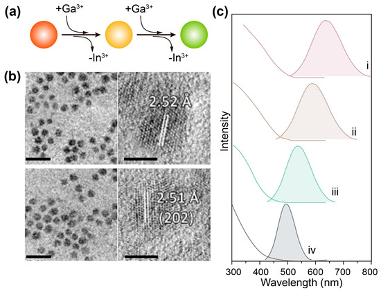 (a) Scheme of the synthesis of AgGaS2 nanocrystals through a cation-exchange approach. (b) TEM images and high-resolution TEM images of AgGaxIn1-XS2 nanocrystals (top panel) and AgGaS2 nanocrystals (bottom), respectively. Scale bars are 10 nm and 3 nm for TEM images and high-resolution TEM images. (c) Absorption and emission spectra of nanocrystals with [Ca]/[In] ratios of (i) 0.85, (ii) 1.56, (iii) 2.88, and (iv) 3.73 in precursors, respectively. Reproduced with permission [98]. Copyright 2019, American Chemical Society.