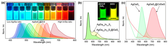 (a) Photographs and photoluminescence spectra of AgGaS2@ZnS nanocrystals with varied Ag/Ga or In/Ga ratios. Reproduced with permission [101]. Copyright 2020, American Chemical Society. (b) Photoluminescence spectra of AgGa0.6In0.4S2 and AgGa0.6In0.4S2@GaSx nanocrystals. Reproduced with permission [103]. Copyright 2018, American Chemical Society. (c) Absorption and photoluminescence spectra of AgGaS2 and AgGaS2@CdSeS nanocrystals, respectively. Reproduced with permission [105]. Copyright 2021, Elsevier Ltd.