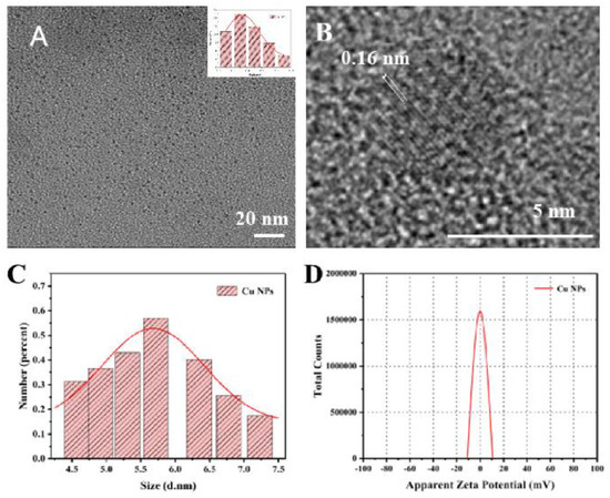 The synthesized Cu NPs, with an average particle size of 2–4 nm and uniform dispersion, are shown in Figure 1A. Due to their small particle size, they exhibit a high specific surface area [40,41]. The Cu NPs also display a lattice surface spacing of 0.16 nm, as observed in Figure 1B.