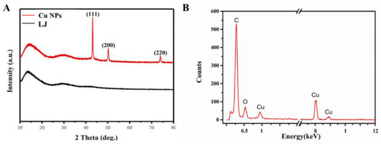 The XRD pattern of Cu NPs, shown in Figure 2A, reveals peaks that are consistent with those of pure copper. The diffraction peaks at 2θ values of 43°, 50°, and 74° correspond to the (111), (200), and (220) planes, respectively, indicating that the sample matches the characteristics of pure copper [10]. The XRD pattern, along with previous EDS analysis, confirms the formation of Cu(0) nanoparticles [42]. The peaks in the EDS spectrum of Cu NPs, rich in carbon and oxygen, can confirm various chemical compounds on the surface of Cu NPs from the source of Lonicera japonica Thunb aqueous extract [43].