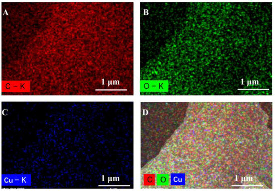 The plant cellulose network in the powdered Lonicera japonica Thunb provides a suitable environment for the loading of Cu NPs, facilitated by the release of internal components during the synthesis of Cu NPs from the reductive compounds of Lonicera japonica Thunb. To address the challenge of recovering copper nanoparticles, we designed an experiment in which copper nanoparticles were synthesized and loaded in a single step using the aqueous extract of Lonicera japonica Thunb. The Cu NPs attached to the cellulose network were obtained by centrifugation and dialysis. The results in Figure 3A,B clearly show that numerous Cu NPs adhere to the plant cellulose of Lonicera japonica Thunb powder. The Cu mapping signal in Figure 4A–D confirms that Cu has been effectively incorporated into the plant cellulose network of Lonicera japonica Thunb powder.