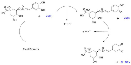 Polyphenols in plant extracts are highly oxidizable [13] and non-toxic, making them ideal reducing agents in green synthesis processes. Unlike traditional chemical and physical methods, green synthesis techniques use natural reactants such as algae, bacteria, and plants, providing a more cost-effective and environmentally friendly alternative [14,15,16]. The plant extract in an aqueous solution stabilizes nanoparticles, preventing oxidation and aggregation during the reduction process [17]. Plant-mediated green nanoparticle synthesis offers a promising approach for producing eco-friendly and functional copper nanoparticles suitable for various applications [18,19].