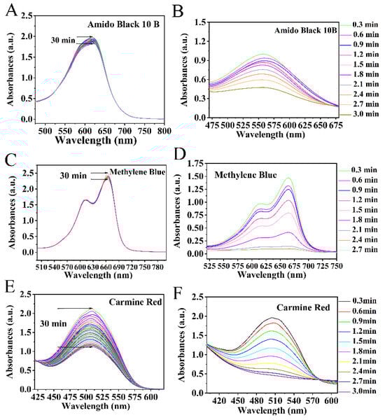 UV–Vis absorption of AB-10B versus time with (A) and without (B) Cu NPs; UV–Vis absorption of MB versus time with (C) and without (D) Cu NPs; UV–Vis absorption of CR versus time with (E) and without (F) Cu NPs.
