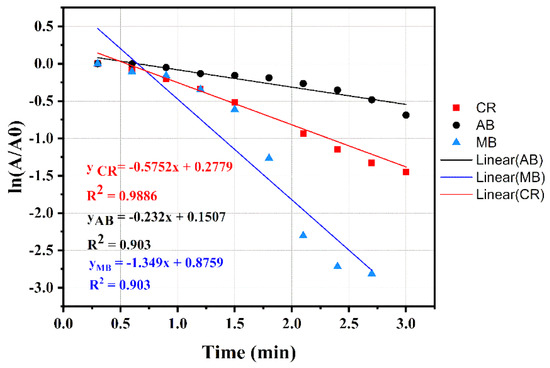 The variation of ln(A/A0) versus time and linear equation for the reduction of AB-10B, MB, and CR.