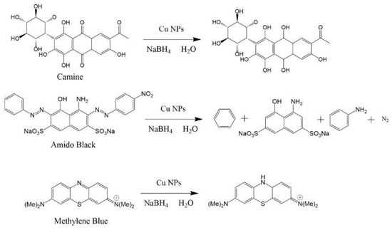 The reaction scheme for reducing AB-10B, MB, and CR using Cu NPs.