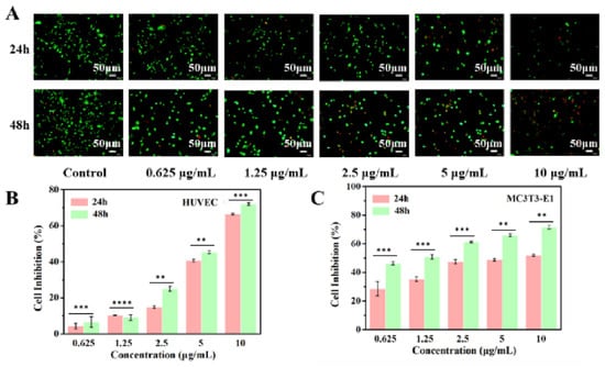 HUVEC cells and MC3T3-E1 cells were cultured in Dulbecco’s modified Eagle medium (DMEM) at 37 °C and 5% CO2. HUVEC cells and MC3T3-E1 cells were obtained from the stem cell bank of the Chinese Academy of Sciences. The medium was added with 10% heat-inactivated fetal bovine serum (FBS) and 1% penicillin/streptomycin antibiotics and kept in a humid environment of 37 °C and 5% CO2. These cells were inoculated and cultured in 24-well plates at a cell density of 1 × 104 cells/well in an incubator at 37 °C and 5% CO2 for one day. The 24-well plates were divided into six groups (blank control group, n = 6):0, 0.625, 1.25, 2.5, 5, and 10 μg/mL groups. The volume of culture medium used for each well plate was 2 mL. Cell viability was assessed using the CCK-8 kit and L/D vital dye, respectively [39]. The original medium was replaced after 24 and 48 h with 100 mL of DMEM containing 10 mL of CCK-8, and the media was cultivated at 37 °C for 2.5 h. The MultiskanFC enzyme labeling device evaluated the absorbance, and the OD 450 nm was recorded and displayed. A drug-loaded scaffold’s cell-inhibitory action might be more clearly shown using L/d reactive dye. The growth media was removed from the well plate after the cells had been cultured there for 24 and 48 h. Then, 100 mL of PBS was added, and the cells were treated there for 15 min with 4 mM calcein and 2 mM ethidium homodimer with dimer. Dead cells are depicted in red, whereas living cells are highlighted in green.