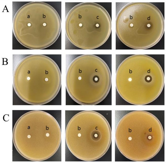 Cu NPs inhibition zones on (A) E. coli, (B) Staphylococcus aureus, and (C) Candida albicans plates. For all photographs, a represents the blank control group in PBS, b represents the sample of Lonicera japonica Thunb extract, c represents the sample of 10 μg/mL Cu NPs, and d represents the sample of 20 μg/mL Cu NPs.