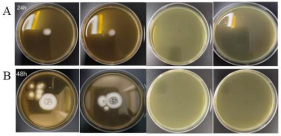 For C. albicans, Cu NPs exhibited inhibitory activity, which aligns with the established inhibition mechanisms of copper against yeast. After 24 and 48 h of incubation, no growth of Aspergillus niger was observed on media containing Cu NPs (Figure 13), indicating the excellent antifungal properties of these Cu NP samples. In contrast, the extract solution without copper showed no antimicrobial activity against any of the four tested strains.