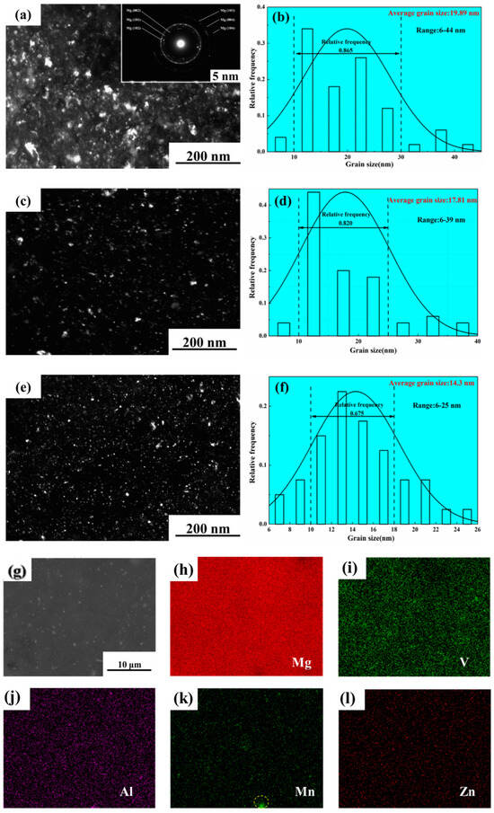 TEM image relating the grain distribution for (a,b) 5 wt.%, (c,d) 7.5 wt.%, and (e,f) 10 wt.% of vanadium. (g–l) SEM image and EDS mapping for 5 wt.% of vanadium in the AZ31 alloy, revealing the uniform dispersion of the reinforcing agent, along with the other elements, such as Al, Mn, and Zn [83].