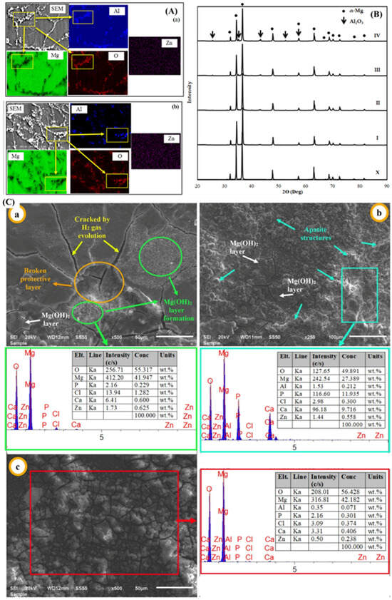 (A) FESEM image and EDS mapping for (a) 2 wt.% of Al2O3 and (b) 8 wt.% Al2O3 of Mg composites. (B) XRD analysis of the composite depicting (X = 0 wt.%, I = 2 wt.%, II = 4 wt.%, III = 6 wt.%, IV = 8 wt.%). (C(a–c)) shows the EDS analysis of the samples after immersion, showcasing the different elemental components in the composite and showing that pitting corrosion is found in the presence of a high Al2O3 content [100].