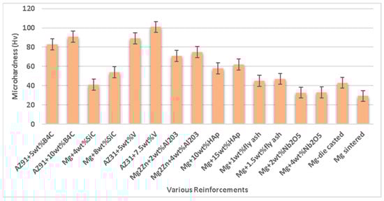 The Orowan mechanism describes the effect of reinforcing particles on the strength of composite materials [102,103,104]. The evenly distributed ceramic particles (SiC, B4C, alumina) hinder dislocation movement, which acts as a function of improved strength [105]. However, superior adhesion and a distinct surface interface delay the detachment of reinforcement from the matrix material, which enhances the overall characteristics of the composites. Kumar et al. [106] investigated the effects of reinforcement with silicon carbide (SiC) in a magnesium matrix on the mechanical characteristics formed via powder metallurgy. The magnesium matrix was blended with 0 wt.%, 4 wt.%, 8 wt.%, and 12 wt.% of SiC in the ball mill. The density of the composite was observed to increase with the addition of silicon carbide due to the reduction in porosity and was found to be at its maximum, i.e., 1.79 g/cm3 for 12 wt.% of SiC. The compressive strength, Vickers hardness, and impact strength of the composite were increased with an increase in the amount of silicon carbide and maximum, i.e., 540 MPa, 71 Hv, and 5 J for 12 wt.% of SiC. Chand et al. [107] analyzed the effects of fly ash in the magnesium matrix material on the mechanical characteristics formed via powder metallurgy. The magnesium matrix was blended with 0.5 wt.%, 1 wt.%, 1.5 wt.%, and 2 wt.% of fly ash in a ball mill. The mechanical characteristics of the composite, such as ultimate tensile strength and yield strength, were increased with fly ash due to the reduction in porosity. But Young’s modulus, microhardness, and elongation (%) were increased up to 1.5 wt.% of fly ash in the matrix; however, beyond that limit, there exists a reduction in Young’s modulus, microhardness, and elongation (%) of the composite due to an increase in porosity. The influence of the types of reinforcement on the mechanical characteristics of Mg-based material composite is depicted in Figure 7.